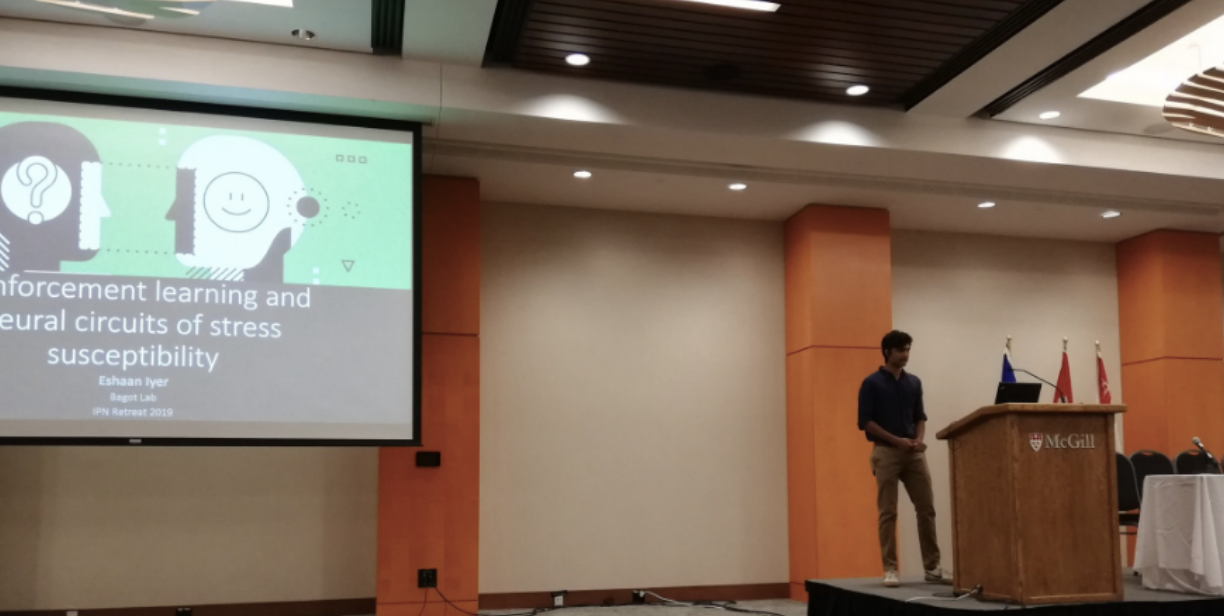Eshaan presenting his work on reinforcement learning and neural circuits of stress susceptibility at the 2019 McGill Integrated Program in Neuroscience Retreat.