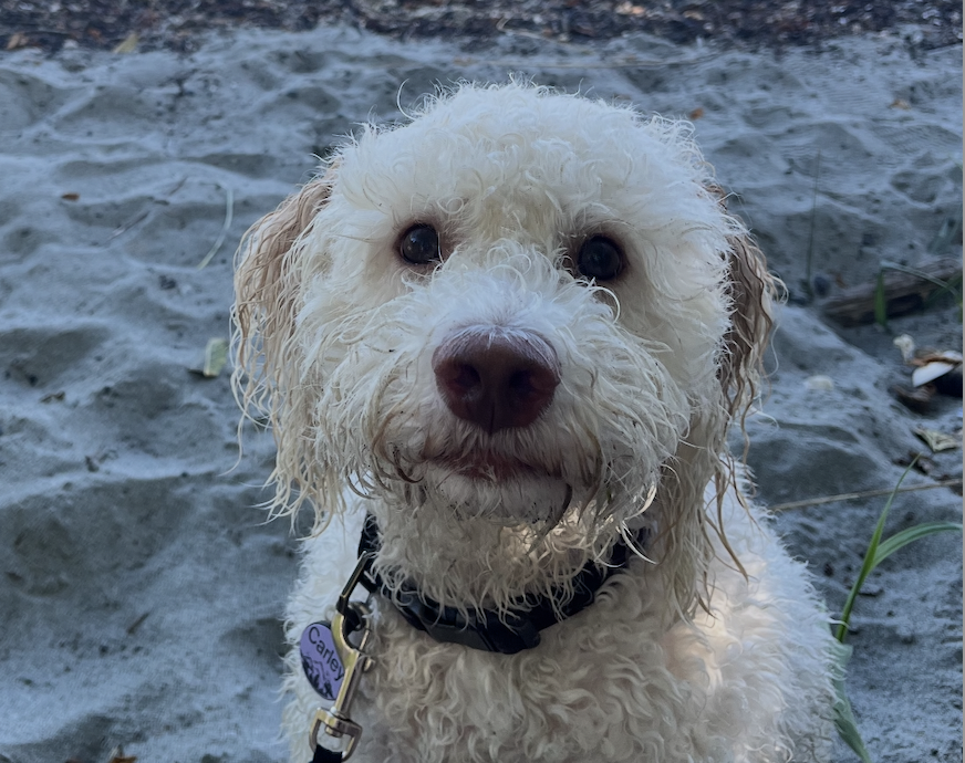 Carley is a rescue Lagotto, who is the sweetest little ball of anxiety. She is just a little lady who will hit your phone out of your hands so you can pet her. She loves licking Santina’s legs (ew), searching for her ball, smelling all the smells, and standing on people with her tiny dagger feet.